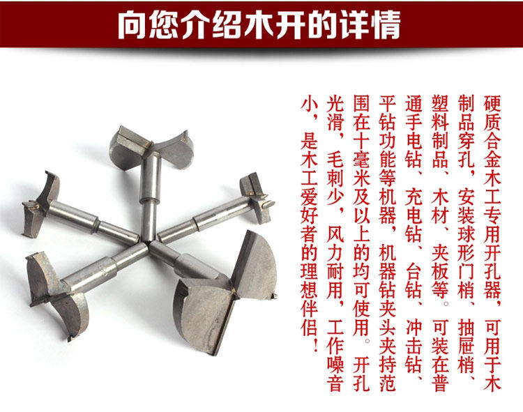 Carbide wood hole saw using carbide welding blade, so that the service life of more than ordinary iron hole opener than the average iron hole more sharp, more durable, more smooth opening, the working noise is smaller, available Perforation of wood products, installation of spherical door tips, drawers tip, plastic products, wood, plywood and so on.