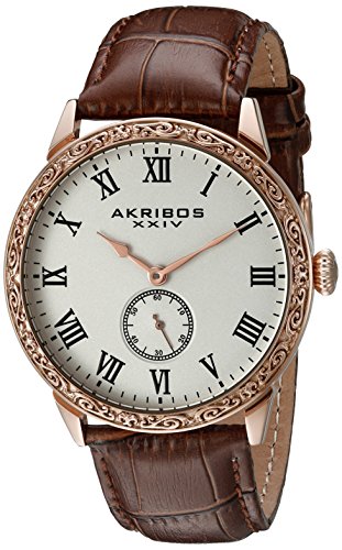 -. Binding : Watch -. Brand : Akribos XXIV -. Color : Brown/Rose/Gold/Silver/Black/ -. Department : mens -. EAN : 0848572071994 -. Feature : Matte white dial featuring classic two hand movement with small seconds / P.R.Inted black roman numerals with rose gold tone spade hour and minute hands / Polished rose gold tone alloy case with scroll design bezel and embossed crocodile pattern brown genuine leather strap / Quartz movement with analog display / Water-resistant to 30 M (100 feet) -. Label : TWI Watches, LLC -. Manufacturer : TWI Watches, LLC -. Model : AK867RG -. MPN : AK867RG -. PackageQuantity : 1 -. PartNumber : AK867RG -. ProductGroup : Watch -. ProductTypeName : WATCH -. Publisher : TWI Watches, LLC -. Studio : TWI Watches, LLC -. Title : Akribos XXIV Men's AK867RG Round White Dial Two Hand Quartz Strap Watch -. UPC : 848572071994
