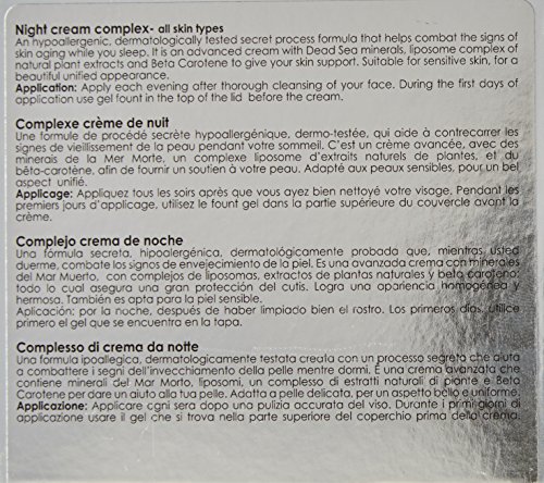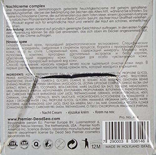 -. Binding : Health and Beauty -. Brand : Dead Sea Premier -. EAN : 5055340936736 -. Feature : Replenishes the skin and increases its elasticity and firmness -.This cream consists of Dead Sea Minerals -.Liposome Complex -.Vitamins A and E -.The most effective anti-aging ingredients -. IsAdultProduct : 0 -. Label : Premier Dead Sea -. Manufacturer : Premier Dead Sea -. Model : A14 -. MPN : A14 -. NumberOfItems : 1 -. PackageQuantity : 1 -. PartNumber : A14 -. ProductGroup : Beauty -. ProductTypeName : BEAUTY -. PublicationDate : 2010-12-20 -. Publisher : Premier Dead Sea -. Studio : Premier Dead Sea -. Title : Premier Dead Sea Night Cream Complex, 2.04 Fluid Ounce
