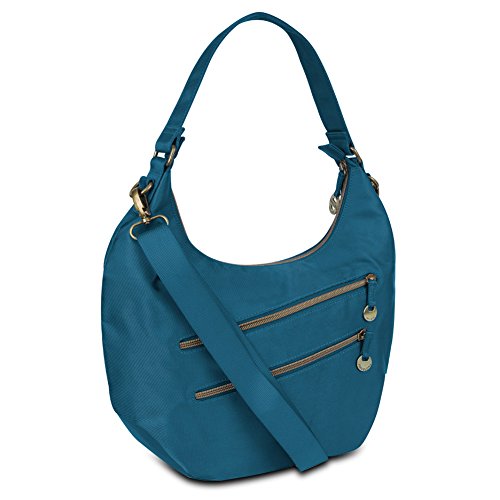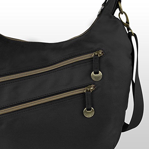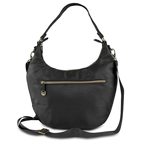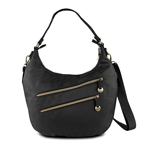 For versatility whether you're out shopping or going on vacation, trust the Travelon Convertible Hobo with RFID Protection. This stylish bag with gold accents is perfect for a variety of uses. It features a large main compartment, with plenty of spots for all your things, plus a slip pocket, zippered pocket, and 5 card slots with a passport slot. Plus, all those slots feature RFID protection so your personal information stays safe from thieves. The bag also includes 3 additional exterior zippered pockets, including one of the back and two on the front. When it's time to go, carry the bag by the attached strap for the ideal shoulder bag or attach the adjustable strap to wear the bag as a low-slung shoulder bag or crossbody.Feature