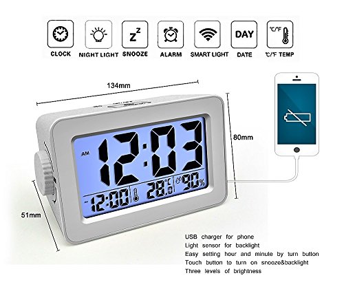 Digital Alarm Clock by DCentral with Temperature and Humidity Displays and USB Port to Charge Phones, Tablets, etc. Three Level Dimmable Backlight with Night Sensor