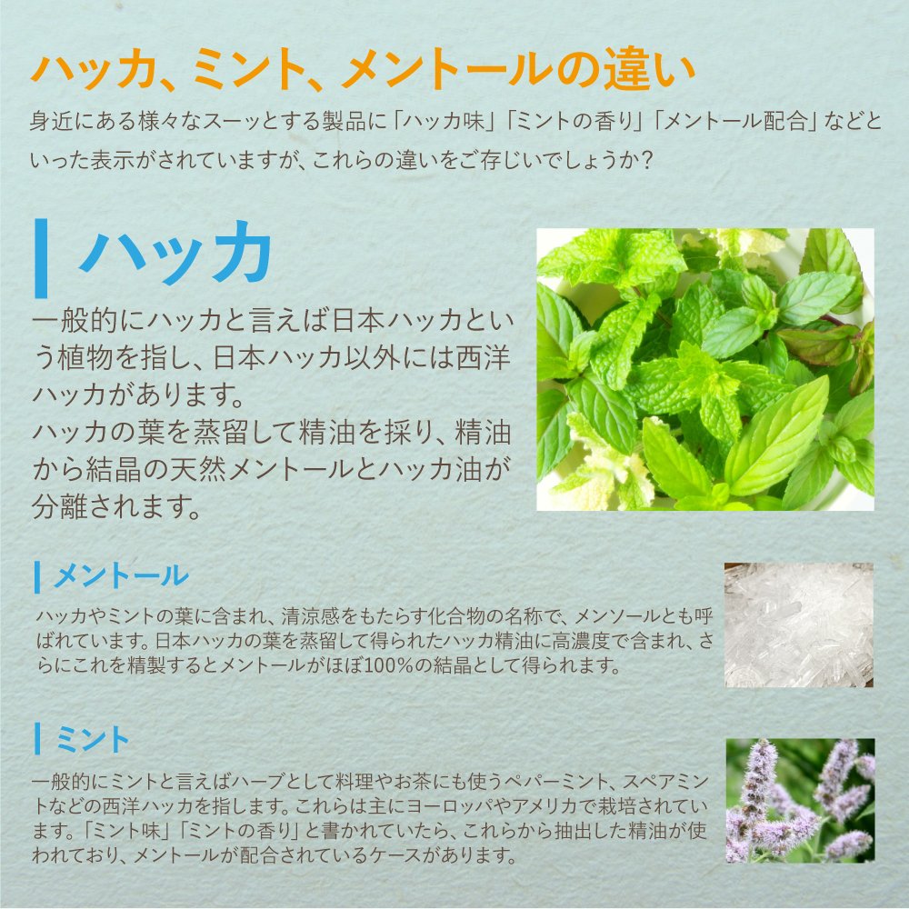 If "mint flavor" "mint flavor" is written, the essential oil extracted from these is used, there are cases where menthol is blended.