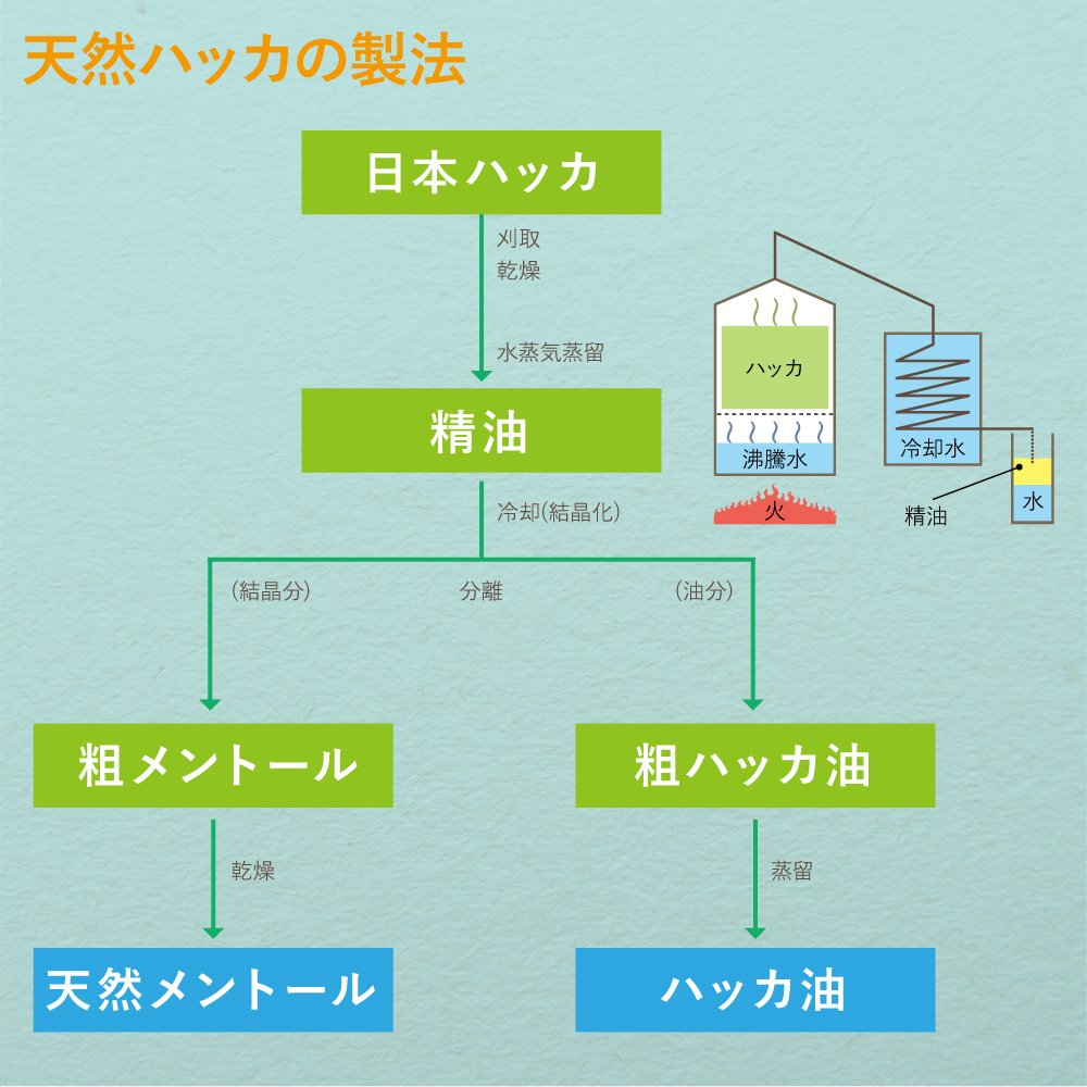Peppermint is used as a raw material for various products, but essential oil and the crystal itself of menthol which is the main component of essential oil are also utilized in various scenes of everyday life.