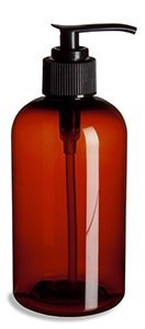 Boston round amber plastic bottles 8 oz. with a black 2cc output downlocking pump