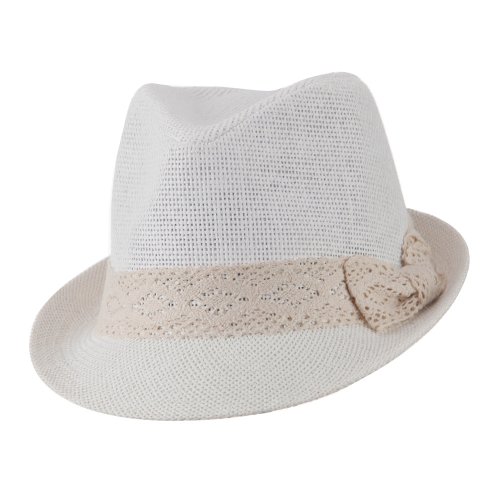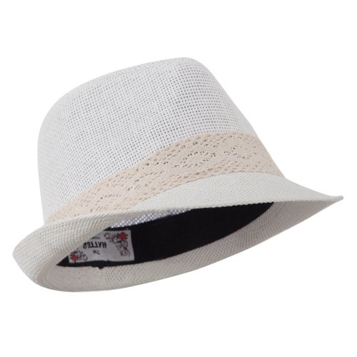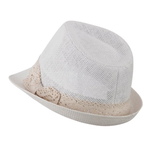 -. Binding : Apparel -. Brand : Hatiya -. Department : womens -. Feature : Made of 100% paper straw. / One Size fits most for women, fitting up to XL. / Crown measures 4 inches deep with inner sweatband, laced ribbon hat band around the crown. / Brim measures 2 inches long, upturned brim in the back. / Thick, light, and cool material. -. ProductGroup : Apparel -. ProductTypeName : HAT -. Title : Lace Band Paper Straw Fedora - White W18S62C