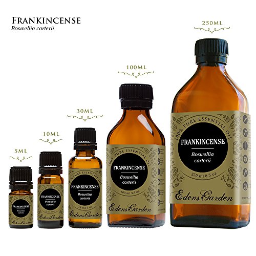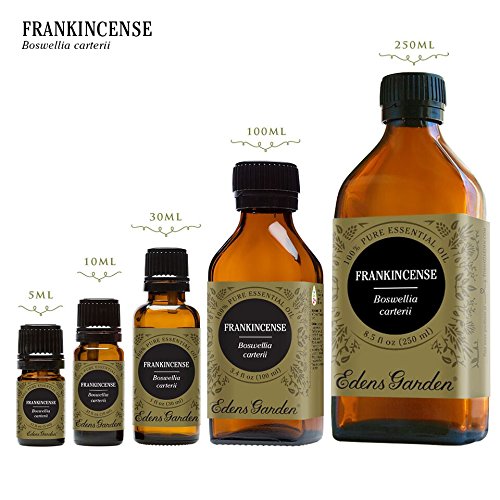 Studio : Edens Garden Publisher : Edens Garden Binding : Health and Beauty Product Description As we grow older, our skin can start to show a little wear and tear. Sun damage or scars can add up leading to a less than ideal derma. Please don't misunderstand us, Edens Garden hopes you love your unique "imperfections" and treasure your facial character. We also understand that dry skin can be frustrating. Frankincense-Carterii acts as a natural application to look and feel fresh. It helps decrease scar tissues and blends fabulously well with Rose and Lavender. Not only does Frankincense-Carterii help heal smooth aging skin, it has an earthy and sweet aroma that can calm the lungs and tense emotions. It can bring relief to respiratory spasms. Many aromatherapists recommend Frankincense-Carterii to help remedy bronchitis, congestion and laryngitis. More than 5,000 years ago, the Ancient Egyptians burned frankincense in holy temples during religious ceremonies and later used the gum as a facial mask to rejuvenate the skin. Native to the Mediterranean, Frankincense is found in sunny, dry locations. The tree grows to about 20 feet and sprouts glossy leaves and white flowers. When the bark is damaged, a resin pours out of the tree. Through a steam dilution process the essential oil is extracted from the resin. BOTANICAL NAME: Boswellia carterii VARIETY: Olibanum ORIGIN: Somalia EXTRACTION METHOD: Steam Distillation PLANT PART: Resin Tears NOTE: Base FAMILY: Burseraceae SYNONYM: Frankincense Sacra BLENDS WELL WITH: Lemon, Myrrh, and other citrus and resins AROMA: Herbaceous, musky, earthy, and resinous CONSISTENCY: Thin COLOR: Clear - Pale Yellow **Euro droppers are not included with 100 250 ml bottles** SAFETY: Follow general dilution guidelines - no urgent safety issues SHELF LIFE: 2 Years 0
