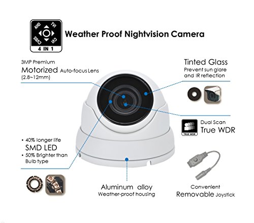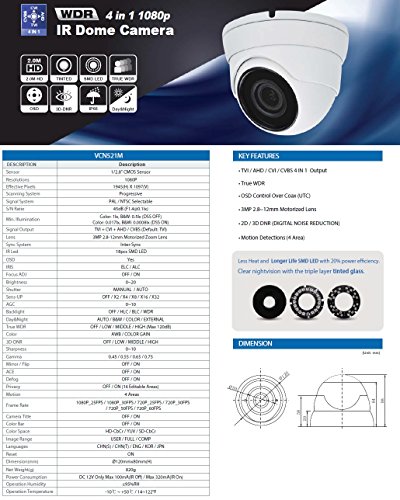 -. Feature : 1080P 1/2.8 CMOS SENSOR TRUE WDR, / SELECTABLE TVI / AHD / CVI / ANALOG OUT, OSD CONTROL OVER COAX(UTC) / 18 SMD IR LEDS AND TINTED GLASS / 3MP MOTORIZED 2.8 MM~12MM PREMIUM LENS / MOTION DETECTION (4 AREA)