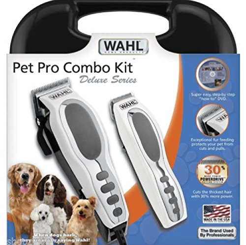 Feature : Brand New. Wahl Professional Pet Grooming Deluxe Kit / Self-sharpening, high-carbon steel blades are precision ground to stay sharp longer / 17 piece grooming kit includes clipper, blade guard, battery operated trimmer, blade guard and more / Powerdrive cutting system easily cuts the thickest hair with 30% more power / Includes a super easy, step-by-step "how to" DVD