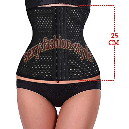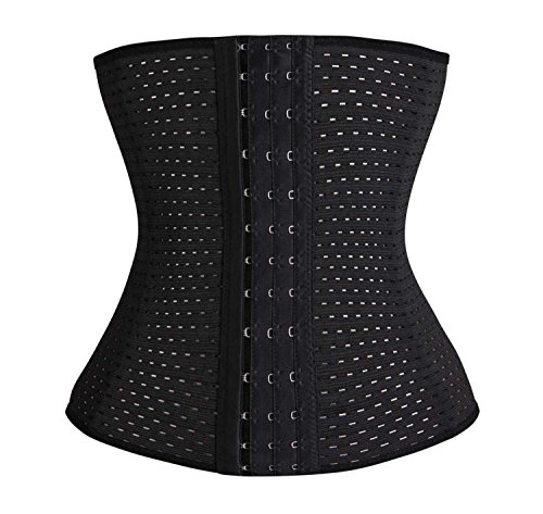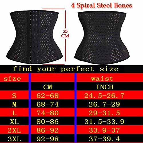 -. Feature : This corset is supported by 4 spiral steel bones, which is the fins material inside the corset. It's flexible and durable, as soft as plastic bones, can bend easily but recover quickly to origin. So it's comfortable to wear all day and improves your posture for an elegant look. / Take it to the gym or for a run outside and let it add impact to your healthy lifestyle routine.This process allows toxins and impurities to exit the skin,while mobilizing fat cells. / The 3 hooks for puerpera corset waist Training, make you Slim and beautiful. Covered in front and back boning for added support, Smooth waistline, Columns 3 Hook And Eye closure classic design, allow you to adjust size as necessary. / High quality fabric breathable and comfortable enough to be worn all day long, sweat-free comfort, antibacterial, moisture wicking. / Please don't use amazon size chart,and use our advice size chart, allow a little inaccuracy due to hand measure
