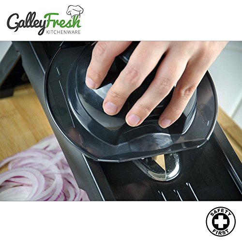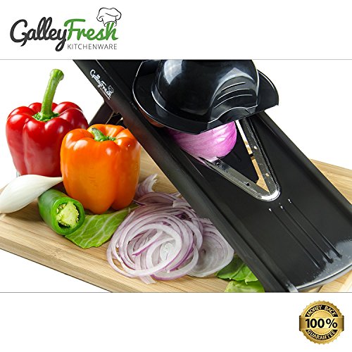DURABLE AND RELIABLE: GalleyFresh mandoline v vegetable slicer can last a lifetime with proper usage due to extremely strong stainless steel blades and a very durable ABS plastic body. Slip-resistant rubber feet stabilize slicer while using and has a protective storage rack that keeps blade inserts safely stashed away.