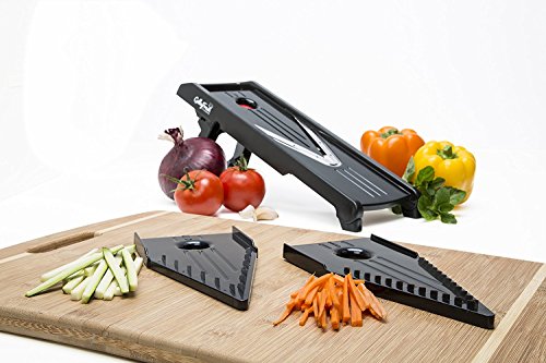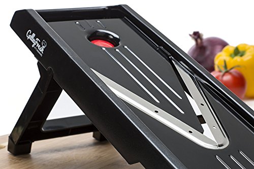 FAST AND EASY: This Mandoline slicer quickly and safely cuts fruits and vegetables with the sharpest V-shaped stainless steel blades. Easily slices a variety of fruits and veggies. Dramatically reduces preparation and cooking times in half.