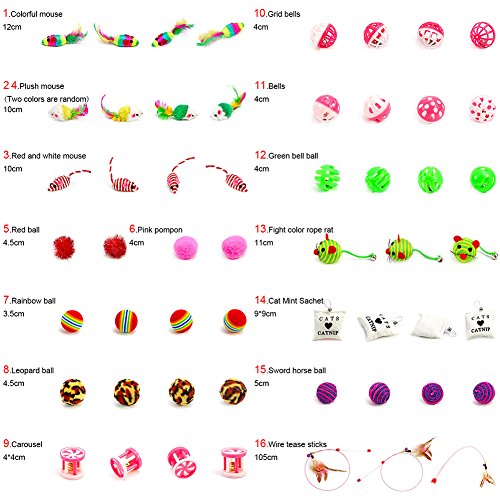 -. Feature : VARIETY:16-Unit Cat Toy Variety Pack includes 15 units of cat's favourite toys + 1 Teaser Wand / GIFT:Cat's Good Players and Friends, Best Gift to Your Cats during Festival Holiday / EXERCISE:Release Cat's Energy, Stabilise their Nervous Emotion, Increasing their Movement to Achieve Weight Loss & Keep Fit Healthy / Featuring feathers, balls and catnip, mice and more will attract your fluffy friend's full attention, making bonding time lovely. / Not a child's toy. Toy should be removed and replaced if excessive wear or damage occurs. Supervise play and remove toys when away.