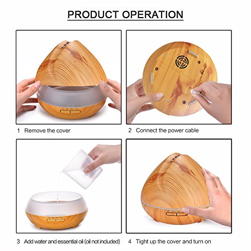 - 550mlDiffuser with Ultrasonic Technology:Convenient capacity (550ml ), enables the unit to run for several hours without refilling. Adopted ultrasonic technology, the 550ml oil diffuser is extremely quiet when working, studying or sleeping.
