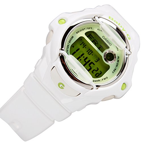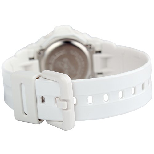 White resin case with a white resin bracelet. Fixed bezel. Lcd dial. Month-day-date. Quartz movement. Scratch resistant mineral crystal. Case diameter: 42.6 mm. Case thickness: 15.4 mm. Water resistant at 200 meters/ 660 feet. Functions: hours, minutes, seconds, date, shock resistant, 12/24 hour formats, 5 day counters, world time, stopwatch, alarm. Casio Baby G Ladies Watch BG169R-7CDR.
