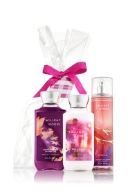 -. Feature : BATH AND BODY WORKS TWILIGHT WOODS ,Enjoy all 3 steps of our All New Daily Trio: super lathering Shower Gel (10 oz), our New Body Lotion (8 oz), now with 2x the Moisture & 3x the Shea, and our skin-loving Fine Fragrance Mist (8 oz). / Notes: Juicy Berry, Sparkling Mandarin, Coconut / Notes: Creamy Frangipani, Soft Mimosa, Wet Honeysuckle, Wild Freesia, AP.R.Icot Nectar / Notes: Oud Wood, Musk, Orris, Vanilla Milk, Warm Wood / Full-Size Bottles (Trio with Cellophane, Ribbon & Gift Tag