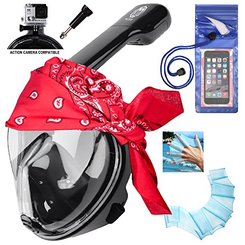 FULL FACE SNORKEL MASK BY MANOKDALA 180 ° PANORAMIC SCUBA DIVING SNORKELING SET ANTI-FOG, ANTI-LEAK TECHNOLOGY FOR MAN & WOMAN, WATERPROOF PHONE CASE, HAND FINS & RED COTTON BANDAGE
