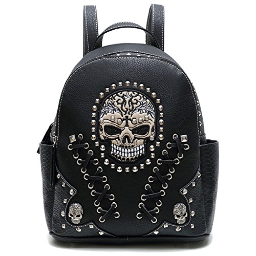 -. Brand : Cowgirl Trendy -. Color : Black -. Department : womens -. EAN : 0688970142434 -. Feature : Made from Vegan Leather - High Quality PU - with a Cotton/Polyester blend lining / Top is zippered close to keep items safely inside / Top is zippered close to keep items safely inside | Interior: 2 zipped compartments, and 1 side zipped pocket / Interior: 2 zipped compartments, and 1 side zipped pocket / Backpack: Length 11.5" Height 11.5" Width 5.5" - 14" Dual Shoulder Drops -. PackageQuantity : 1 -. ProductGroup : Shoes -. ProductTypeName : HANDBAG -. Title : Western Sugar Skull Punk Art Rivet Studded Biker Purse Women Backpack Bookbag Python Shoulder Bag Black -. UPC : 688970142434