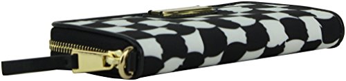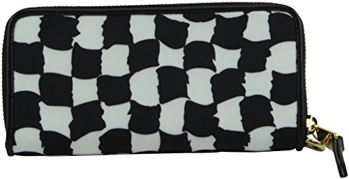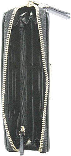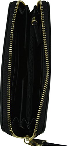 -. Feature : Wraparound zip closure; Gold tone hardware / Accordion style interior. Lined interior / 3 gusseted compartments. Interior features 5 card slots; 2 bill pocket, & 1 coin zipper pocket / Optional wrist strap. Length:7 1/2" / Measurement: 5" W x 4" H x 1" D