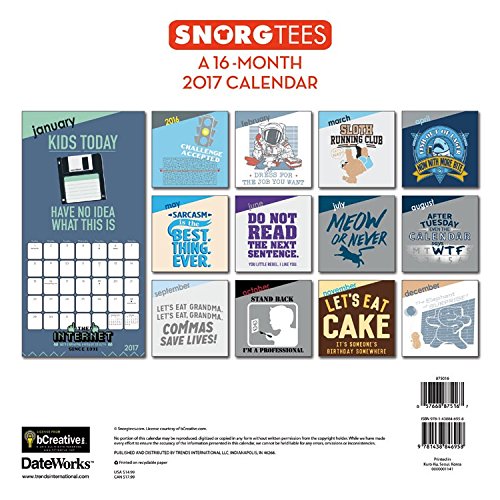 -. Feature : Snorg Tees Calendar 2017 -- Deluxe Snorg Tees Wall Calendar (12x12). / This Snorg Tees 2017 Calendar measures 12x12 inches closed, 12x24 inches opened. / 16-month Snorg Tees calendar 2017 includes 13 stunning images with large grids. This 12" x 12" calendar features an opening spread with a beautiful four-month (September-December 2016) calendar to plan the last months of the year and prepare for 2017. / This Snorg Tees calendar includes large grids to mark appointments and events. 2017 calendar observes major holidays and moon phases. / The perfect gift for the desk and office of any Snorg Tees fan.