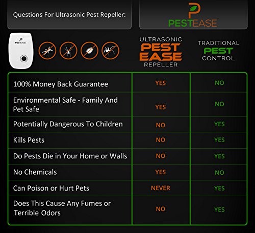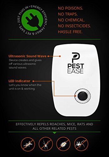 -. Feature : STOP SUFFERING! GET RID OF ALL TYPES OF RODENTS & INSECTS - Protect your Home from all unwanted pests without using any dangerous chemicals, sprays or traps that can harm you, your family, and animals. It is safe for humans and common household pets. Works for Rats, Mice, Ants, Roaches, Spiders, Bugs, Cockroachs, Flies, and other insects & Gerbils / HOW DOES IT WORK? - PestEase Ultrasonic Pest Repeller uses the latest state-of-the-art ultrasonic technology to drive pests away. The ultrasonic can act upon the hearing and the nervous system of the mice, rats and insects to make them unpleasant and uncomfortable in your home, which forces them to leave your home. Outdoor pests and insects & Gerbils will no longer try entering your Home. / GREAT ECONOMIC SOLUTION! - ENERGY EFFICIENT - No more spending hundreds or even thousands of dollars of costly pest control services. Simply plug the PestEase Ultrasonic Pest Repeller device into an outlet and that's it! Your home will be free of all insects and rodents for a fraction of Monthly Pest Control Treatments. / 100% ENVIRONMENTAL FRIENDLY & FAMILY & PET SAFE - Forget the harmful chemicals, poisons, and traps typically used in households and by pest control technicians. PestEase Ultrasonic Pest Repeller is 100% safe even for Pregnant Women. PestEase Repeller is Eco-Friendly and Naturally drives pests out without killing them. No need to clean up dead insects and rodents anymore. PestEase Ultrasonic Pest Repeller creates an uncomfortable environment for pests so they will simply leave your Home. / 100% MONEY BACK GUARANTEE: Use the PestEase Ultrasonic Pest Repeller risk free for 30 days. If our Ultrasonic Repeller does not help to get rid of your pest problem, we will refund 100% of your purchase. No questions asked