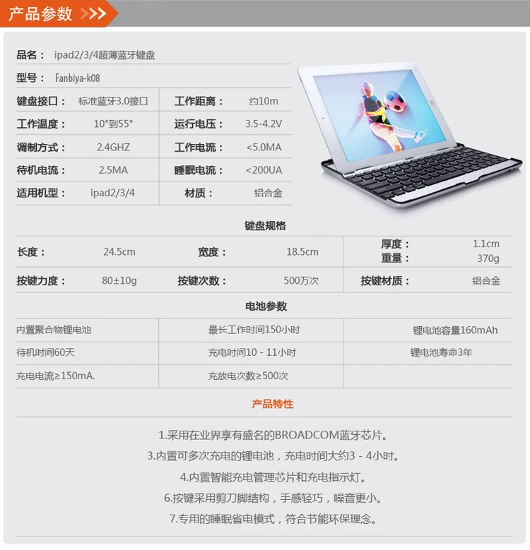 Here we introduce is tailored specifically for iPad2/3/4 Aluminum Keyboard Buddy Case. As the name suggests, this is mainly to create a protective sleeve made ​​of aluminum alloy material. In appearance, it has a thin, eye-catching design. Manufacturers its rating "highly innovative pull the wind designed to provide durable protection for iPad2/3/4" is.