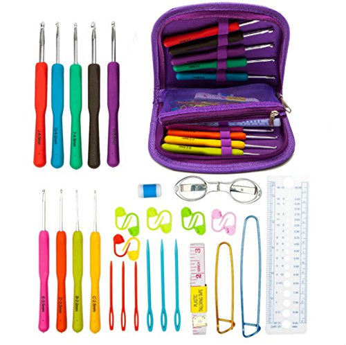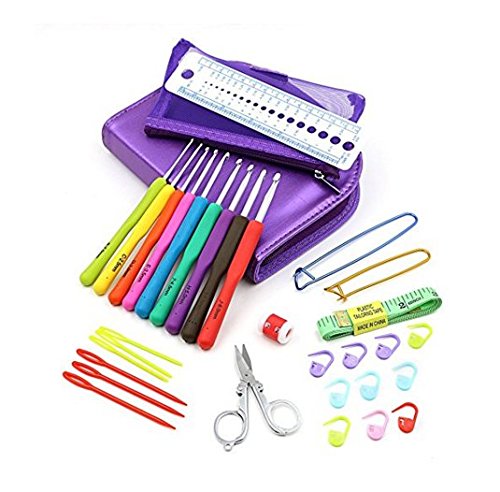31pcs DIY Knitting Tools Set-9 Crochet Hooks B(2mm)~ J(6mm) with Comfortable Rubber Handles and Complete Knitting Accessories ,Best Gifts for Crochet Lover in Sturdy Case Box (Purple)