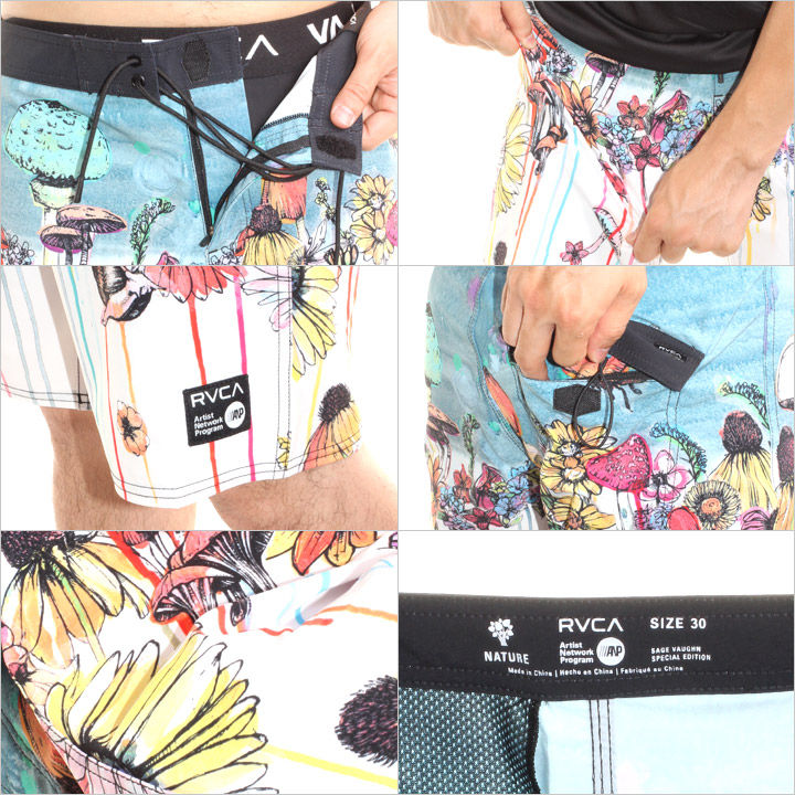 どんな動きにも対応する4WAYストレッチの本格的なサーフパンツに、裾にはANPタグを、バックポケットにもRVCAのミニタグを配置したさりげないアクセントがたまらない仕上がり。