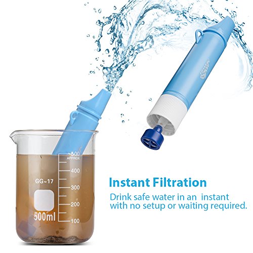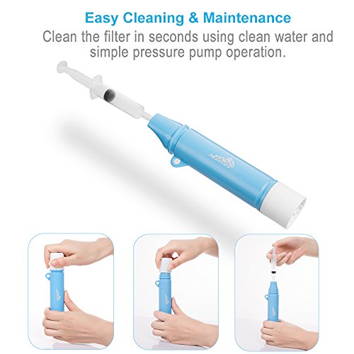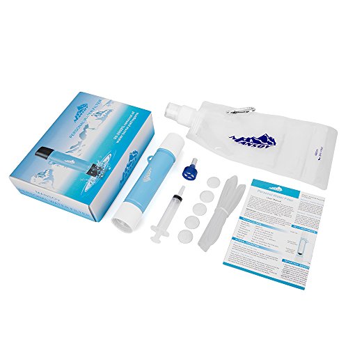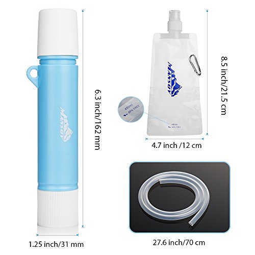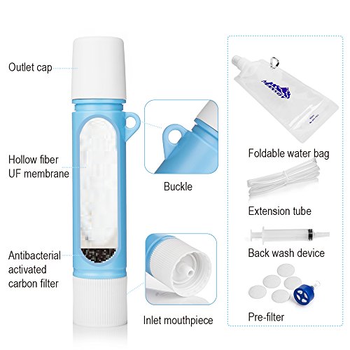 PACKAGE CONTENT: Purified straw, foldable water bag, back wash device, extension tube, pre-filter, user manual