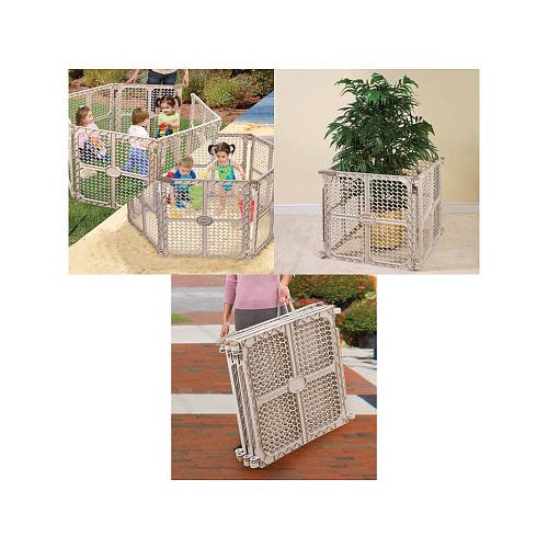 - Feature : Extra tall panels, 30". inside area is 18 1/2 square feet. / Neutral colors blend with home decor / Walk through door with handle for quick access to child. / Door panels swing both way.