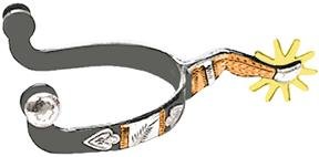 Product Description This Spur Features A 3/4" Blued Steel Band With A Engraved Silver Copper Overlay, 2 1/2" Gal Leg Shank, And A 1 1/4" Brass 10 Point Rowel. 0