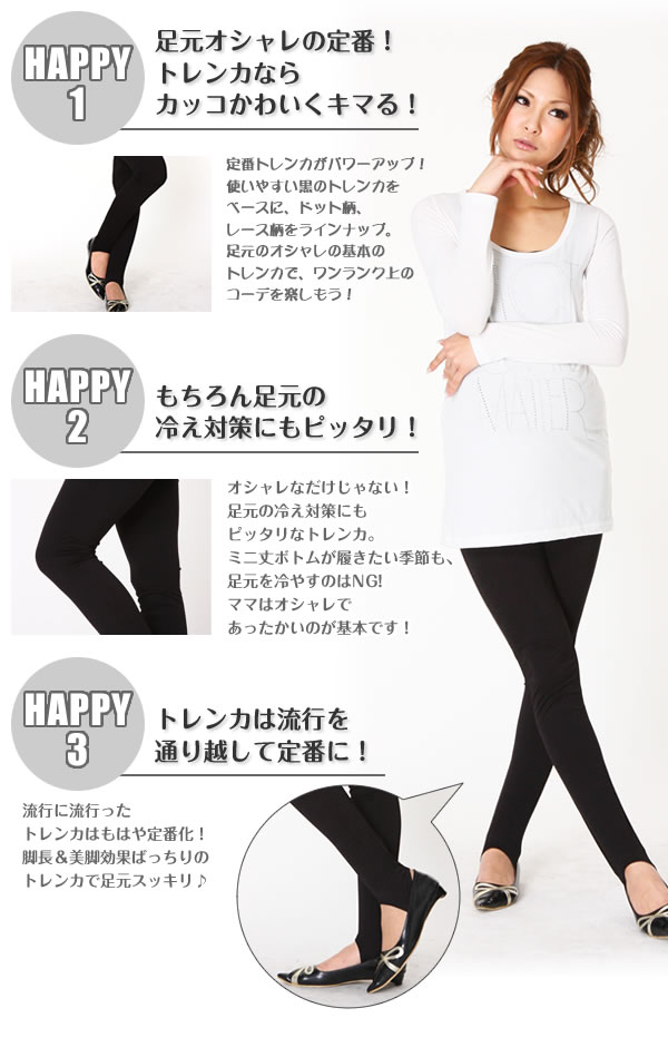 | 足元オシャレの流行は定番へ!おしゃれトレンカで美脚を目指そう!シンプルな黒に加え、ドット柄、レース柄をラインナップ。ブラックカラーなので、どんなコーデにもあわせやすい、オシャレで使える1枚です。 |