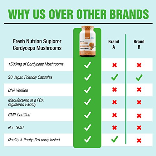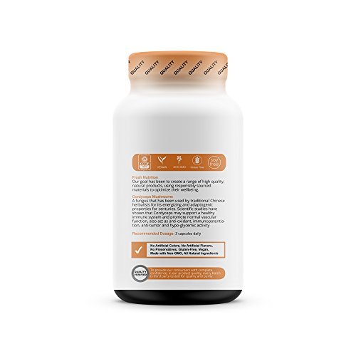 -. Feature : STRONGEST AND CHEAPEST AVAILABLE WHILE BEING ORGANIC: Our New Organic Cordyceps Mushrooms capsules offer a potency of 1500mg per serving while giving you 90 capsules per pot, meaning, they are probably the strongest available on Amazon, while also being the cheapest and most value for money! / 1 MONTH SUPPLY AT LAUNCH P.R.ICE: Each pot lasts 1 month when taking 3 capsules a day, why not buy in bulk while our special launch P.R.Ice is available! / ENDLESS BENEFITS FROM THIS POWERFUL ANTIOXIDANT: Made with fresh cordyceps, this natural detox supplement has shown to be a healthy natural immune supporter, adrenal health enhancer, free radical scavenger, help with healthy vascular function, offer immunopotentiation properties, while offering blood sugar support (hypo-glycemic activity). / USED FOR CENTURIES BY CHINESE HERBALISTS: A fungus that has been used for traditional Chinese herbalists for its energizing and adaptogenic properties for centuries. Ours are carefully sourced from the world's largest cordyceps cultivator being extremely potent. We verify that we have the purest cordyceps with a DNA profile, proving 100% that they are an exact match for wild cordyceps. / HIGH STANDARDS: Our Organic Cordyceps Mushrooms are certified CCOF Organic, contain No Artificial Colors, Flavors or Preservatives, Vegan safe, NON-GMO, Gluten-Free, Soy Free, manufactured in a FDA registered facility and made in the USA, while every batch is third party tested for quality and purity.