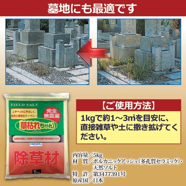 雑草を除去するには、抜くか農薬を散布するか・・。 除草剤には人間やペットに害を与えるだけでなく、土壌にも悪影響を残します。本品は、そんな悩みを解消。新しい発想の除草材は、過去の塩害をヒントに開発された天然素材に手を加えたもの。農薬のように即効性はありませんが、多孔質セラミックにより、天候に左右されることなく、最長約10ヶ月もの間、効果を持続することに成功しました。また、薬剤でないので、お子様やペットのいるご家庭でも安心してお使いいただけます。墓地などの除草にも最適です。草枯れちゃんを使用後の土壌は酸性化しておりますので、再び草花を植える際は、ホームセンター等で販売されている石灰をよく混ぜて中和した状態に戻し、少し時間を置いてから植えてください。