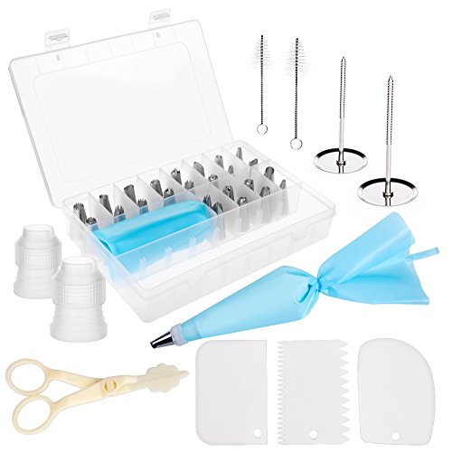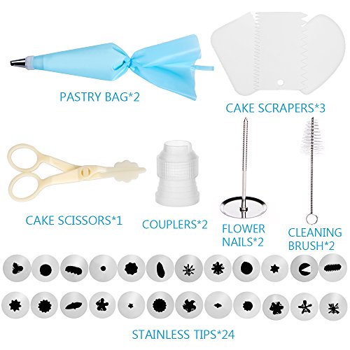 CAKE DECORATING SUPPLIES KITS - 24 stainless steel icing tips, 2 reusable silicone pastry bags, 2 reusable plastic couplers, 2 flower nails, 1 Cake Brush,3 Cake Scrapers,1 Flower Lifter with which you can create all types of patterns on cake, cupcakes.