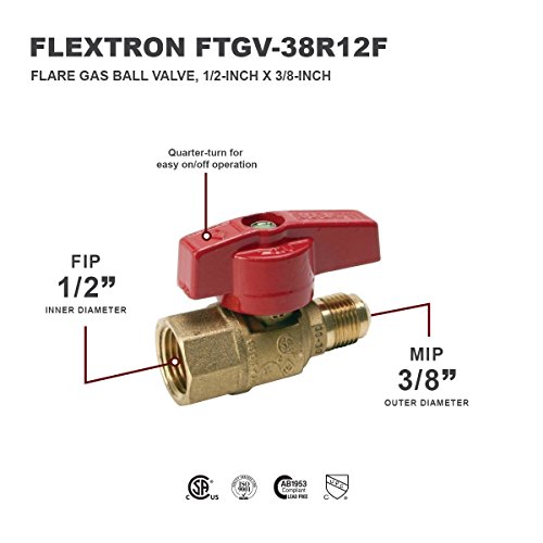 Flextron FTGV-38R12F Gas Valve with 3/8 Inch Outer Diameter Flare x 1/2 Inch FIP Ball Valve Fittings for Gas Connectors with Quarter-Turn Lever Handle, Brass Construction, Corrosion Resistance
