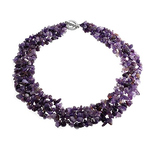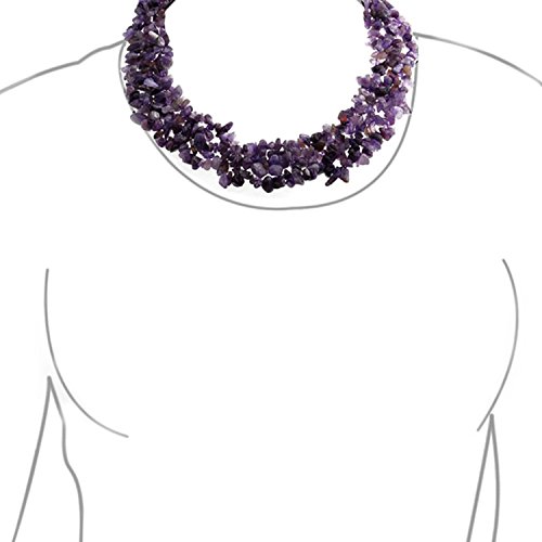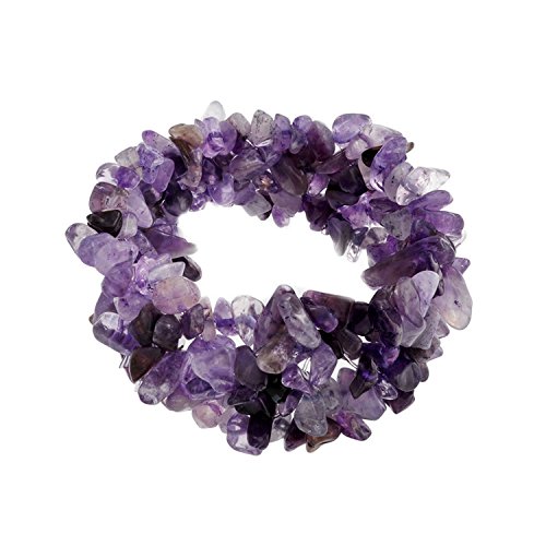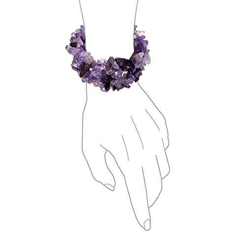 Set the tone for summer with this gorgeous gemstone jewelry set. Once reserved for only royalty, the Amethyst gemstone has an enviable beauty that make you feel like a queen when you wear our purple Amethyst bib necklace and chunky stretch bracelet set. This chunky gemstone necklace features natural polished Amethyst chips on multiple interwoven strands that secure with a silver toned toggle clasp. The purple stretch bracelet features the same woven multi strand design that easily stretches for easy adornment. Cluster necklaces and Amethyst bracelets are hot for summer, and their simple yet bold design allows them to be worn for any occasion. Amethyst jewelry always makes a great February birthstone gift.Feature