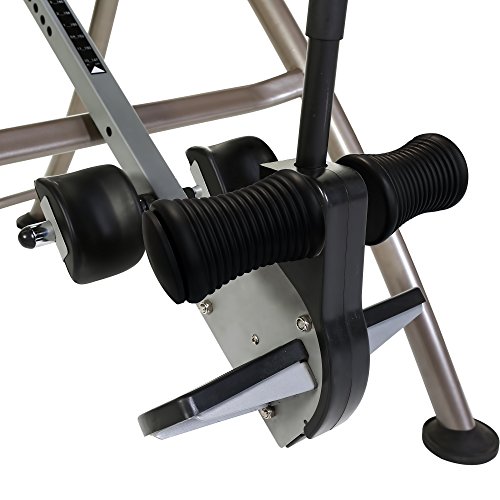 The Ironman "iControl" 600 is built with an exceedingly strong steel frame with a scratch resistant powder coated finish. It has our unique ribbed "Air Tech" soft foam backrest that will firmly and evenly support the head and back while allowing air flow when inverting. Extra long safety handles provide easy return to the upright position. The Revolutionary iControl Disk Brake System completely eliminates the old tether strap system to control the angle of inversion. The iControl allows you to lock the backrest at any angle, so you can just relax,without the hassles of balancing your body while inverting.The iControl system is extremely easy to use, so you do not have to keep adjusting the tether strap to change the inversion angle.The Ironman 600 inversion table will provide excellent stress and back relief and at the same time you will feel that you are in total control and safe while experiencing inversion therapy.User height adjustments 4'10" up to 6'6".iControl allows the user to lock the table at a full 180 degree vertical inverting position. iControl completely locks the table when mounting and dismounting.iControl eliminates the typical tether safety strap found on other inversion tables.iControl allows the user do crunches and sit-ups at 180 degrees. UL Certified for safety and endurance, meeting the UL 6061 standard for inversion tables.Easy to reach patented ankle "Ratchet" system utilizes an extended handle for easy locking and unlocking.Can be folded for storage