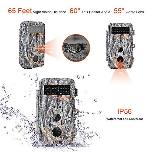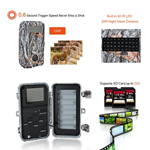 1. HD Photos or Videos and PIR function: the camouflage digital trail camera can be triggered by sudden change of ambient temperature caused by any movement of human or animals in a certain region of interested, which is detected by a high sensitive Passive Infra-Red (PIR) sensor (PIR up to 60°detection angle and night vision up to 65ft), and then captures pictures (highest to 16MP), or records HD video (1280*720P) clips and save into SD card(support up to 32 GB) automatically.