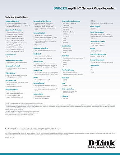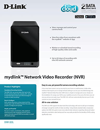 -. Binding : Electronics -. Brand : D-Link -. Color : Black -. EAN : 0790069365065 -. Feature : Eliminates Need for a Dedicated PC / 2 Drive Bays for up 8TB of Storage / mydlink Cloud-enabled for simplified remote access / Remote Viewing Apps for iPhone, iPad, Android Phones & Tablets / H.264, MPEG-4 and MJPEG Compression and Record on Motion Detection / Record up to 9 D-Link IP Cameras with support up to 3 Megapixel Resolution -. IsAutographed : 0 -. IsMemorabilia : 0 -. Label : D-Link -. LegalDisclaimer : The buyer's is required to set up and configure the equipment on their network before it become operational. Manuals are easily available at the manufacturer's website for this camera. -. Manufacturer : D-Link -. Model : DNR-322L -. MPN : DNR-322L -. NumberOfItems : 1 -. OperatingSystem : Linux -. PackageQuantity : 1 -. PartNumber : DNR-322L -. Platform : Linux -. ProductGroup : Photography -. ProductTypeName : SURVEILANCE_SYSTEMS -. Publisher : D-Link -. ReleaseDate : 2014-09-22 -. Studio : D-Link -. Title : D-Link Camera Business Video Recorder mydlink-Enabled (DNR-322L) -. UPC : 804993409051 -. Warranty : Comes with Manufacturer Warranty.