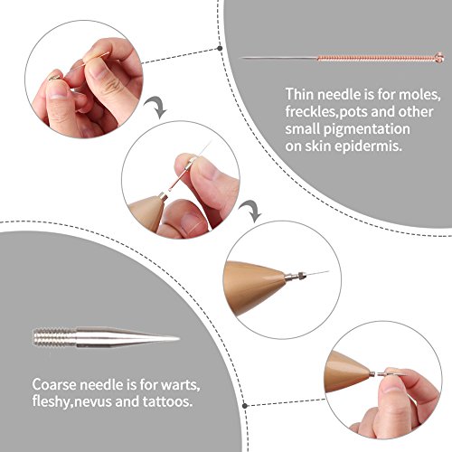 - 【Skin Tags Removal】 This portable, rechargeable mole removal pen has built-in overcharge protection. You can easily charge it via cellphone charger, power bank, or even a car charging port. Charging cable included. High capacity batteries offer 2-4 hrs of runtime when fully charged. Comes with 2 coarse needles, 15 fine needles. 6 adjustable strength levels(equivalent of 8 strength levels) for different skin tolerance and different pigmentation on skin.