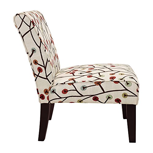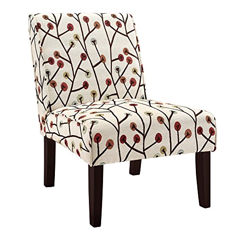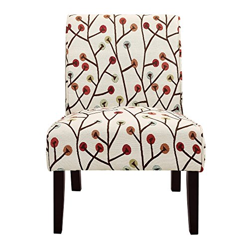 The Teagan Armless Accent Chair is sure to liven up your living space. Beautifully upholstered in a playful floral polyester blend fabric, the Teagan Chair will add a splash of visual interest to your living room, entryway, guest room, children's bedroom, or office. The chair features piped fabric edges on the sides of the chair, a slightly curved backrest for comfort and generous padding in the seat and back for durability. The wood frame and solid wood tapered legs ensure that the Teagan Armless Chair will get years of quality use.Feature