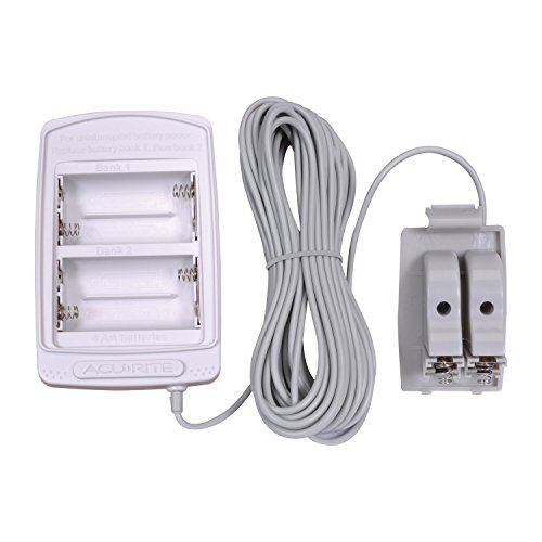 Makes battery replacement easy for AcuRite 5-in-1 sensors mounted on Roofs, poles, or other hard-to-reach locations^Extra-long 30-foot cable lets you keep the batteries in a remote, weather-resistant compartment that you can mount in a ground-level location^Setup is easy: battery pack inserts into the battery compartment on any AcuRite 5-in-1 weather sensor. Secure the cord in place with the Included clips, then position where desired^No sensor data is Lost during battery changes! dual-compartment design allows for replacement of batteries without loss of power to the sensor^Includes mounting hardware