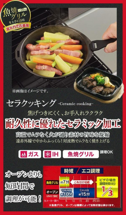 | 焦げ付きにくく、お手入れラクラクなグリルパンです。耐久性に優れたセラミック加工が施されています。遠赤外線で中からふっくら!対流熱でムラなく焼き上げ、素材の旨味を凝縮します。 |
