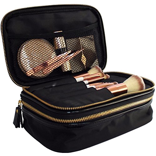 - SATISFY YOUR ORGANISATIONAL NEEDS with sections for brushes, tools and makeup, there's a place for everything. The top section holds your makeup brushes and small pouch can hold your beauty tools. The large bottom compartment will store all your makeup must-haves