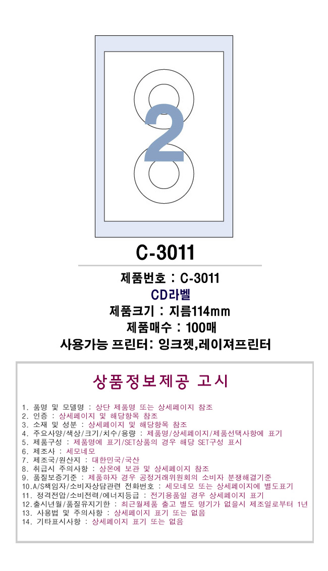 - 품명 및 모델명C-3011 CD라벨(2칸:1x2)(지름114mm)(100매)