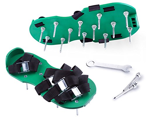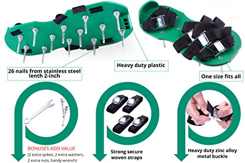 HIGH QUALITY 13 metal spikes is in great use on soil, fast in cleaning but has no use on stone, paths or asphalt. 4 strong straps with metal buckles that won't breake, fixes the lawn aerator shoes in place better, than other aerator sandals with 3 or 2 straps. Now the buckles on your shoes won't breake or come off easily.