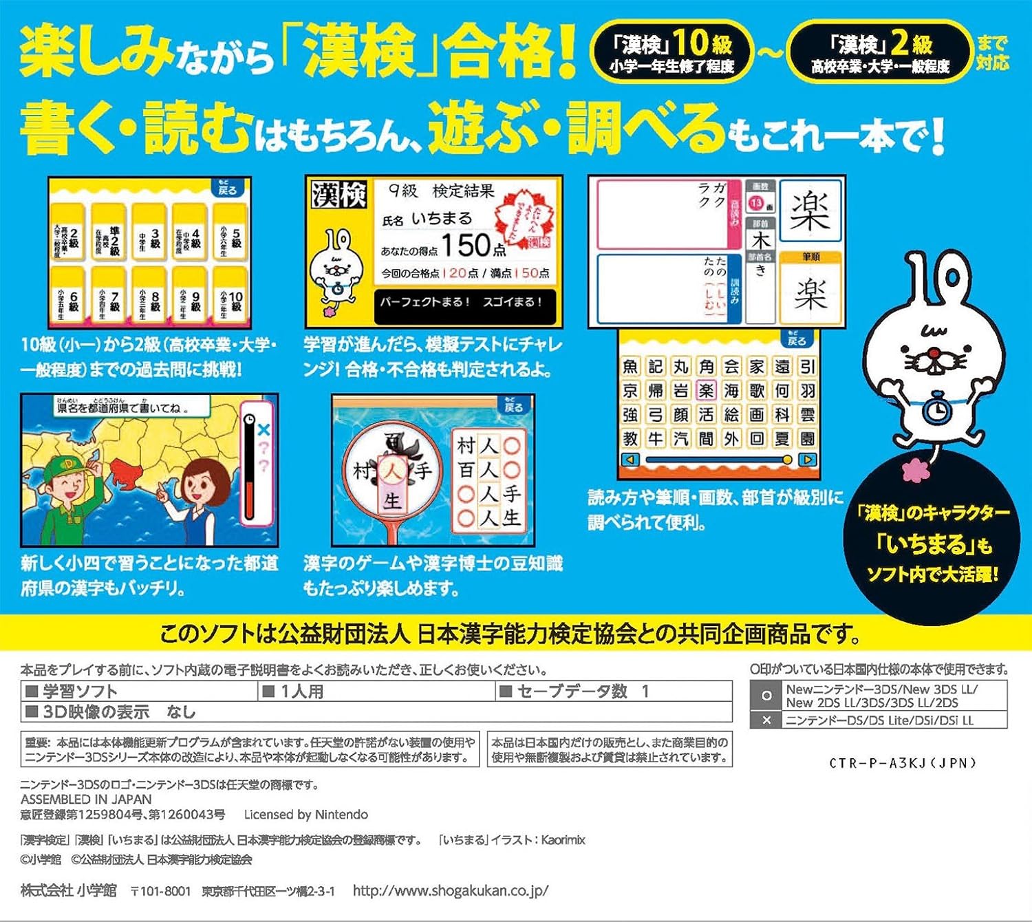 家庭だけではなく学校などでも使える有意義な漢字学習ソフトです。 2020年の学習指導要領の改訂により、1006字から1026字へと学習漢字が増え (30年ぶり! ) 、漢字学習に対する注目が集まっています。 日本漢字能力検定協会の公認を受け、漢検10級 (小ー終了程度) ~2級 (高校卒業・大学・一般程度) までの最新の過去問に対応。これまでのドラえもんシリーズのノウハウを注ぎ込み、漢字を使ったミニゲームで遊びの要素も大いに加味されています。 ゲームプレイ後には漢字文化研究所・所長の阿辻先生による「漢字ミニ知識」も読め、まさに漢字三昧なソフトです。 漢検のキャラクター「いちまる」もソフト内で大活躍! 小学生を強く意識した唯一無二の漢字学習ソフトです。