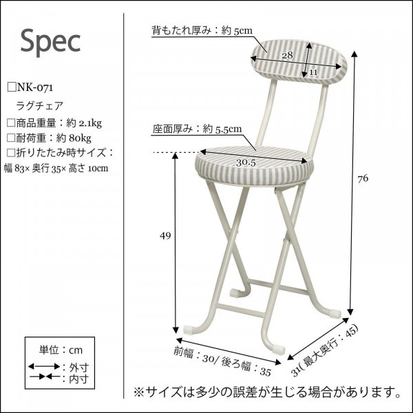 | 仕様 | 完成品 折りたたみ可 座面耐荷重:約80kg 座面ロック機能 脚先ゴムカバー付 |