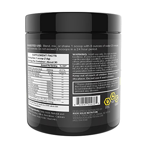 -. EAN : 0852847004365 -. Feature : Maximum strength pre workout energy booster for next level results / Perform stronger and longer during intense workouts with scientifically proven ingredients / Rapidly build muscle mass and burn fat with minimal exhaustion and increased oxygen capacity / Hard hitting results with endless energy while boosting strength and promoting muscle fullness / Great tasting mango flavor will be the best zero calorie dietary supplement you've ever tried -. IsAdultProduct : 0 -. Label : Rock Solid Nutrition -. Manufacturer : Rock Solid Nutrition -. PackageQuantity : 1 -. ProductGroup : Health and Beauty -. ProductTypeName : DIETARY_SUPPLEMENTS -. Publisher : Rock Solid Nutrition -. Studio : Rock Solid Nutrition -. Title : Rock Solid Nutrition Pre Pump PreWorkout Supplement, Cherry Limeade -. UPC : 852847004365