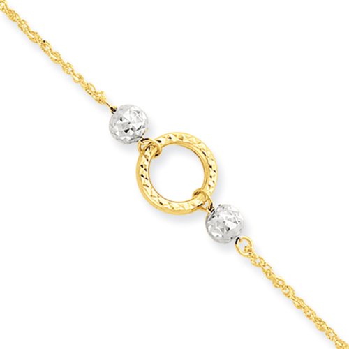 -. Binding : Jewelry -. Brand : The Black Bow -. Color : Yellow -. Department : womens -. Feature : Two-tone 14k yellow and white gold design / Polished and diamond-cut finish / Features 4mm hollow beads & a 9mm open circle charm / Adjustable 9 to 10 inches in length / Includes our custom gift box -. Label : The Black Bow -. Manufacturer : The Black Bow -. Model : A8343-10 -. MPN : A8343-10 -. NumberOfItems : 1 -. PackageQuantity : 1 -. PartNumber : A8343-10 -. ProductGroup : Jewelry -. ProductTypeName : FINENECKLACEBRACELETANKLET -. Publisher : The Black Bow -. Studio : The Black Bow -. Title : Black Bow Jewelry 14k Two-Tone Gold Ropa Chain, Circle and Bead Anklet, 9-10 Inch
